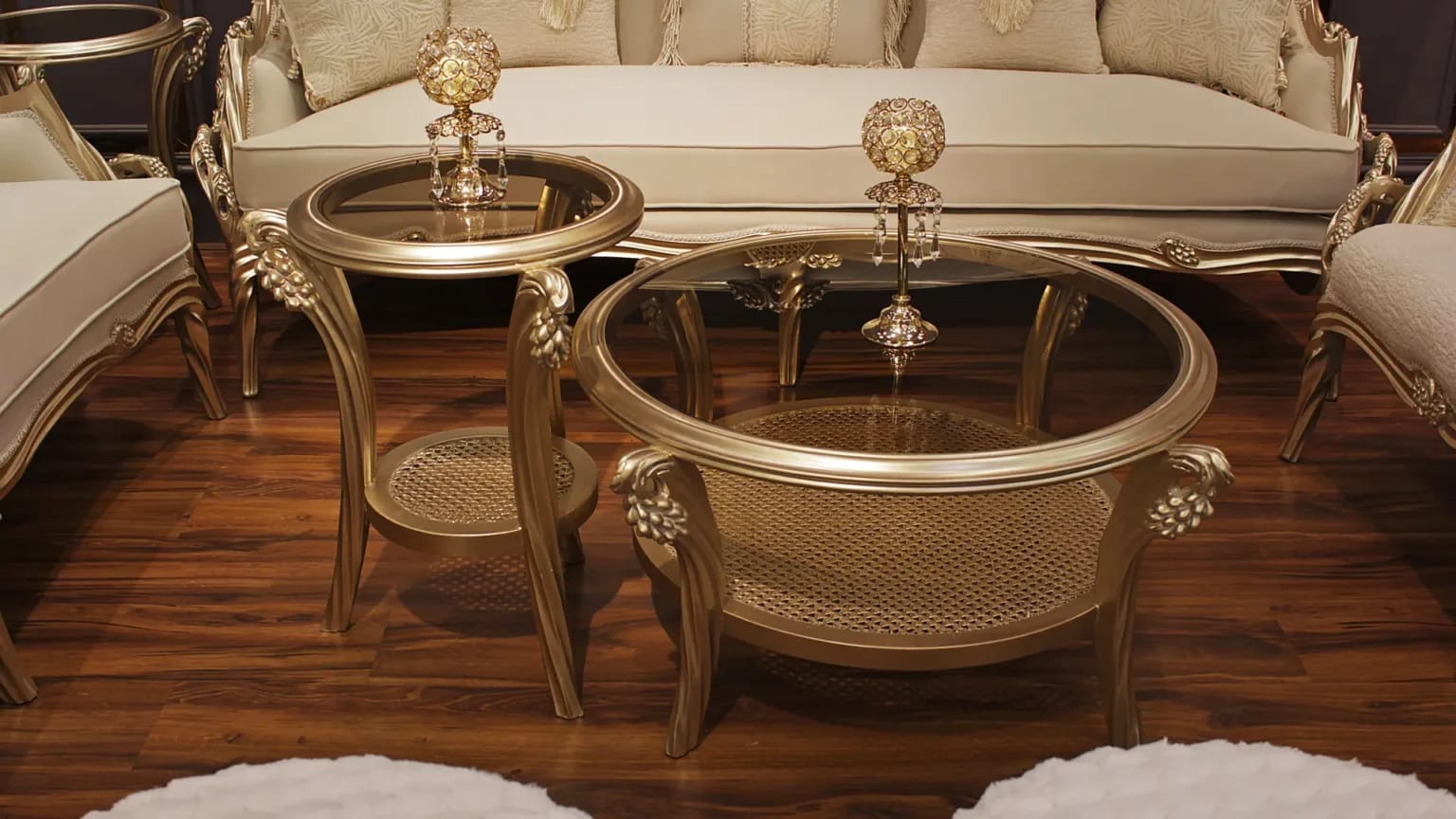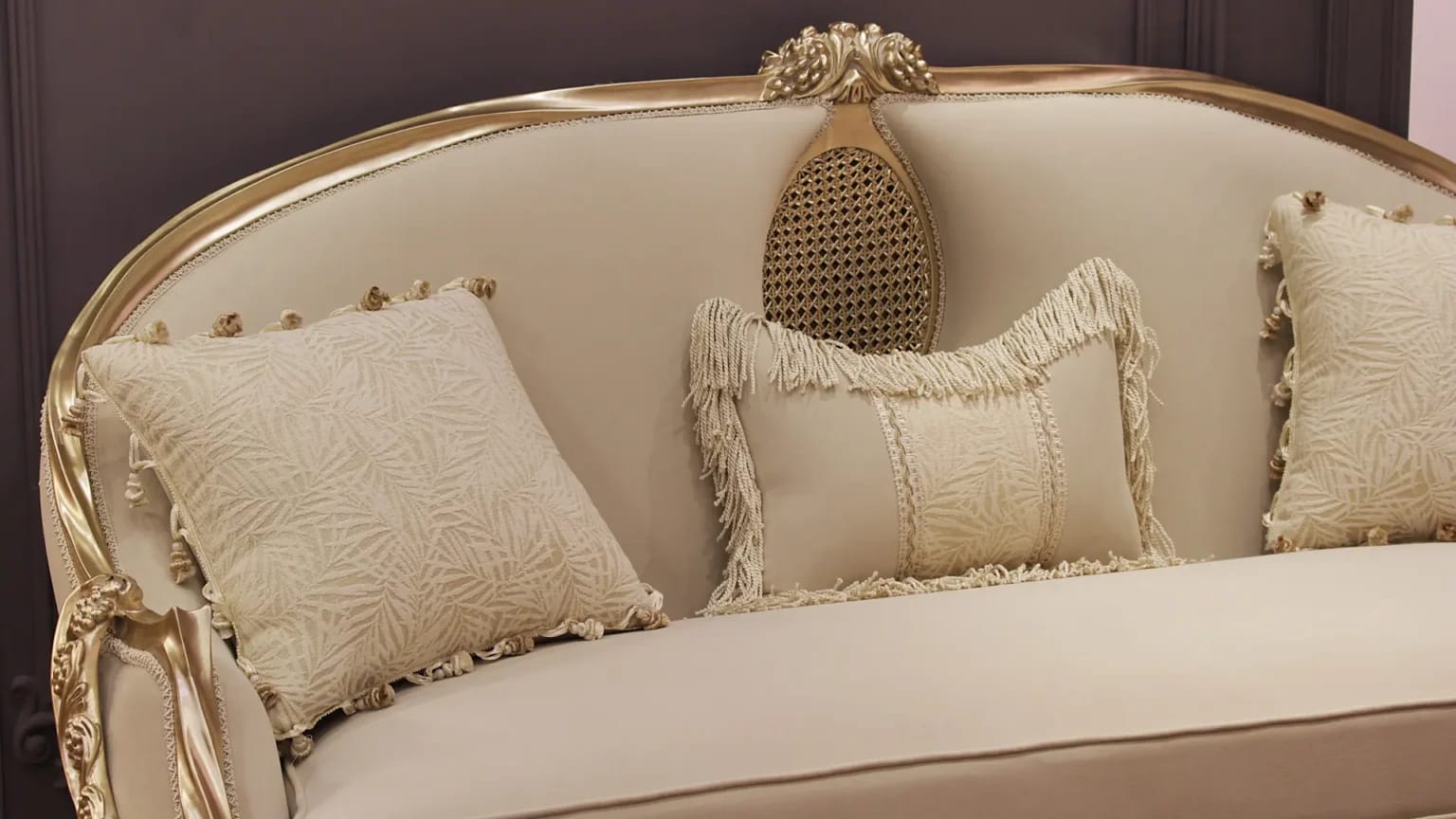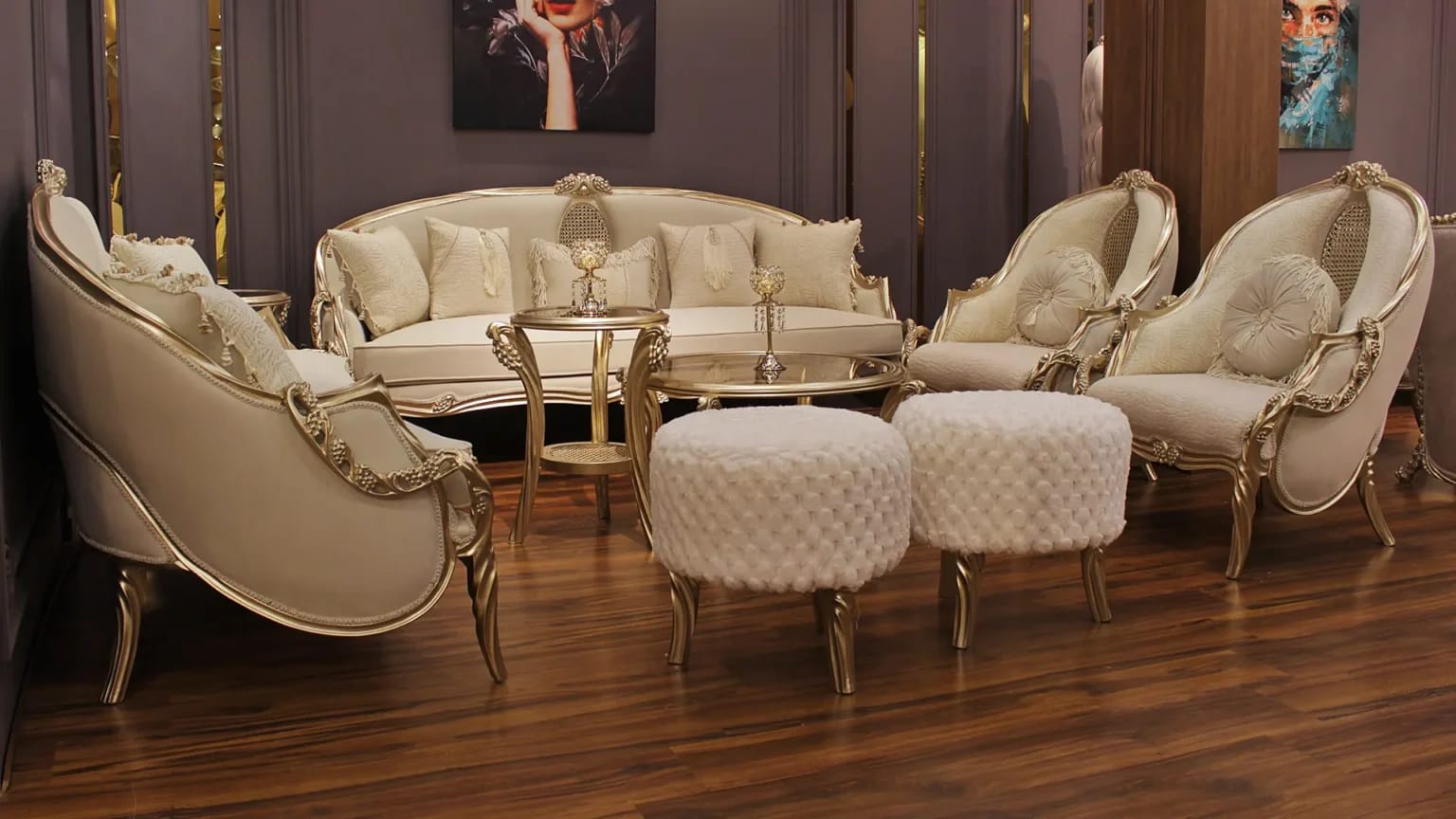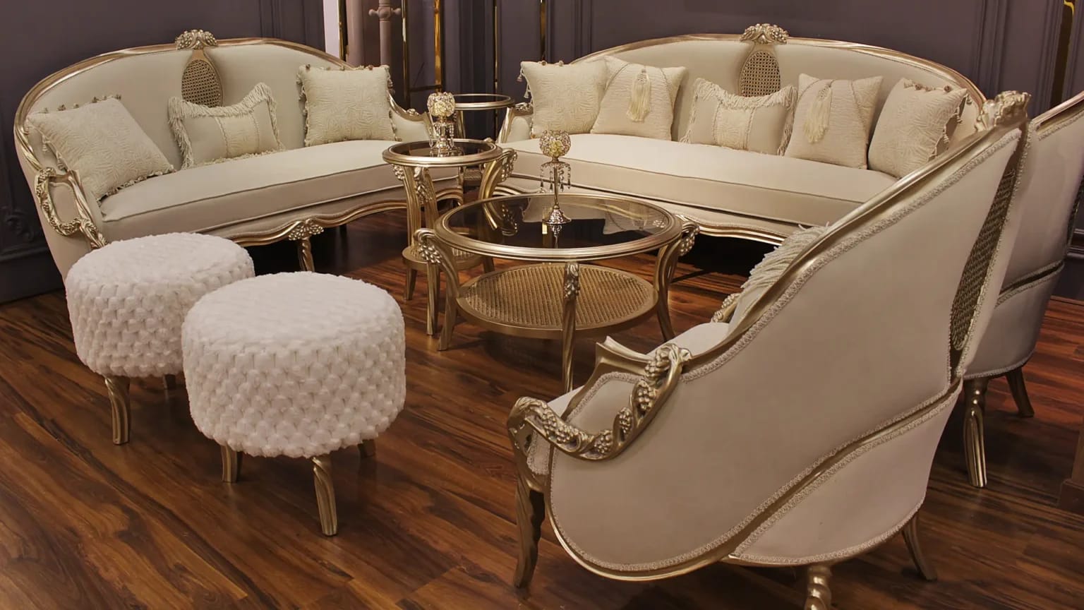 الصالون معمول من خشب زان روماني أحمر تقيل وقوي، النوع اللي يعيش سنين ويستحمل الاستخدام من غير ما يتأثر، ويدي إحساس بالفخامة والثبات من أول مرة تشوفه.