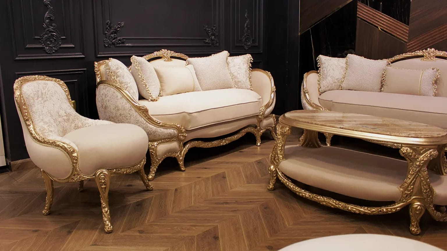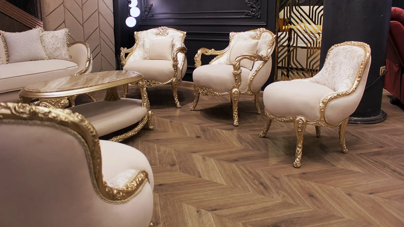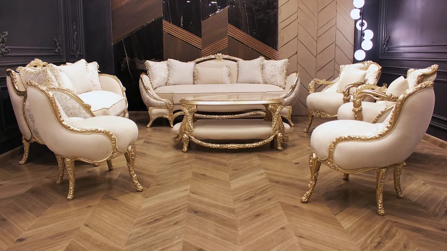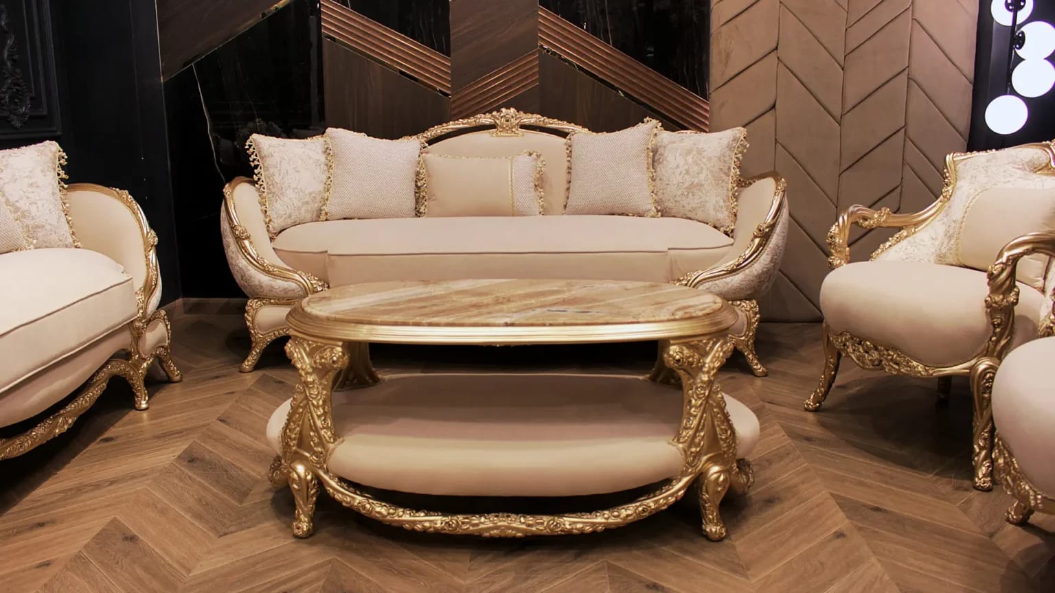 الصالون معمول من خشب زان روماني أحمر تقيل وقوي، النوع اللي يعيش سنين ويستحمل الاستخدام من غير ما يتأثر، ويدي إحساس بالفخامة والثبات من أول مرة تشوفه.