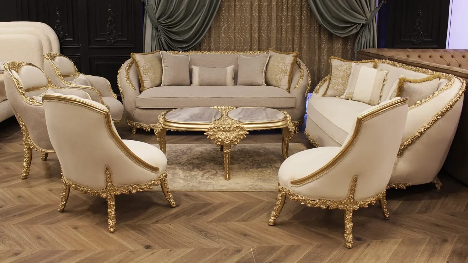الصالون معمول من خشب زان روماني أحمر تقيل وقوي، النوع اللي يعيش سنين ويستحمل الاستخدام من غير ما يتأثر، ويدي إحساس بالفخامة والثبات من أول مرة تشوفه.