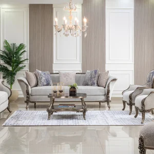 متنجّد بقماش معالج عملي ومريح، سهل في التنظيف ومصمم يتحمل الاستخدام اليومي، وفي نفس الوقت محافظ على شكله وأناقته علشان الصالون يفضل دايمًا شكله جديد.