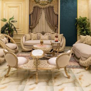 الصالون معمول من خشب زان روماني أحمر تقيل وقوي، النوع اللي يعيش سنين ويستحمل الاستخدام من غير ما يتأثر، ويدي إحساس بالفخامة والثبات من أول مرة تشوفه.
