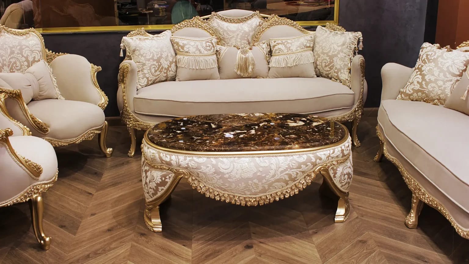 الصالون معمول من خشب زان روماني أحمر تقيل وقوي، النوع اللي يعيش سنين ويستحمل الاستخدام من غير ما يتأثر، ويدي إحساس بالفخامة والثبات من أول مرة تشوفه.