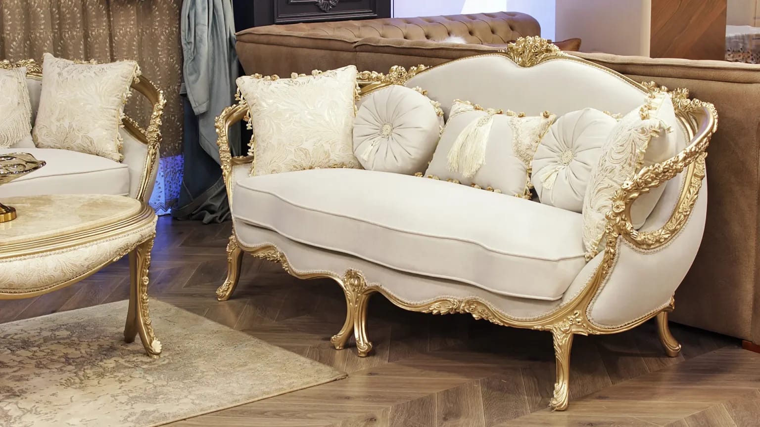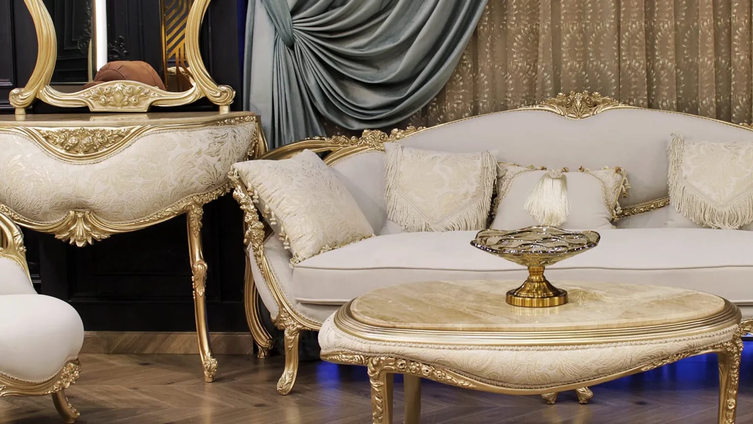 الصالون معمول من خشب زان روماني أحمر تقيل وقوي، النوع اللي يعيش سنين ويستحمل الاستخدام من غير ما يتأثر، ويدي إحساس بالفخامة والثبات من أول مرة تشوفه.