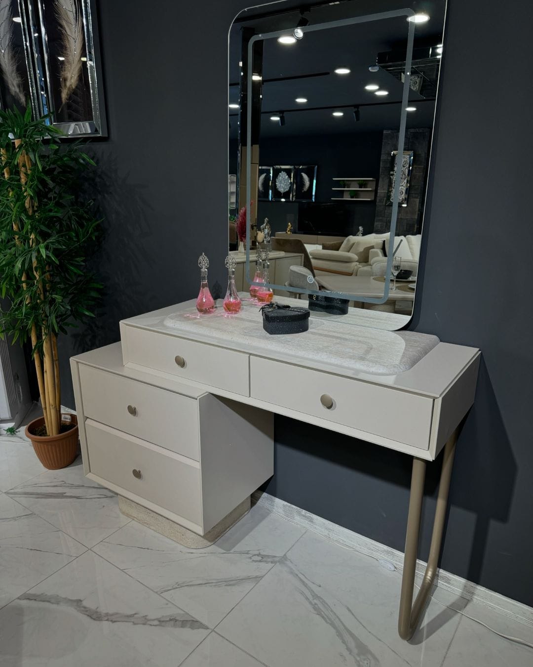 🪞 تسريحة 120 سم مع مرآة بلورية تعكس الضوء وتضفي إحساسًا بالرحابة والبهجة. مساحة مثالية لروتينك اليومي.