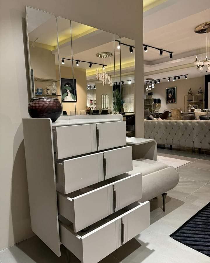 🪞 تسريحة 120 سم مع مرآة بلورية تعكس الضوء وتضفي إحساسًا بالرحابة والبهجة. مساحة مثالية لروتينك اليومي.
